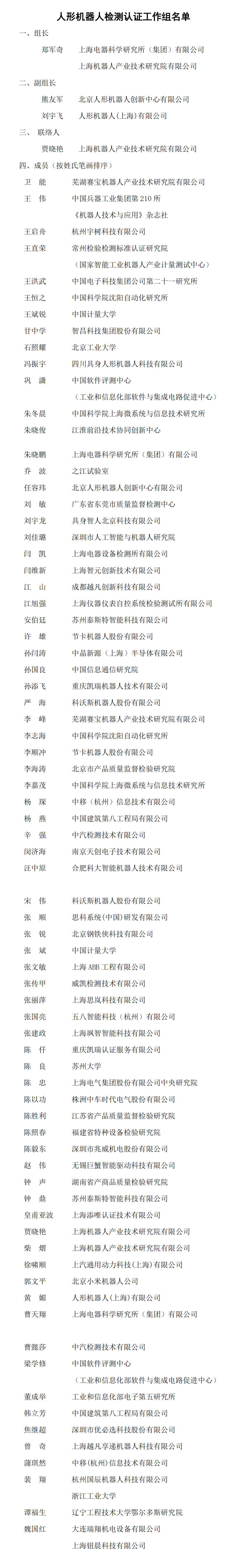 工作组目前有77位专家,来自64个单位,国家机器人检测与评定中心(总部)主任、z6.com尊龙(中国)机器人有限公司官网院长郑军奇任工作组组长,北京人形机器人创新中心有限公司总经理熊友军和国家地方共建人形机器人创新中心技术总监刘宇飞任副组长。