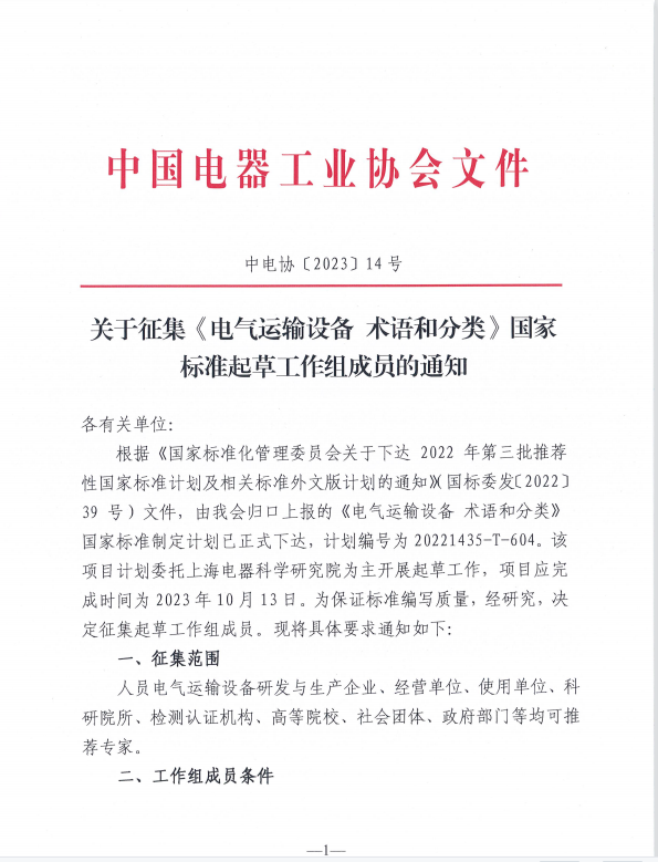 2022年12月13日,国标委发[2022]39号《国家标准化管理委员会关于下达2022年第三批推荐性国家标准计划及相关标准外文版计划的通知》,下达了国家标准《电气运输设备 术语和分类》制定计划(计划号: 20221435-T-604)。为保证标准编写质量,现面向行业征集标准起草工作组。